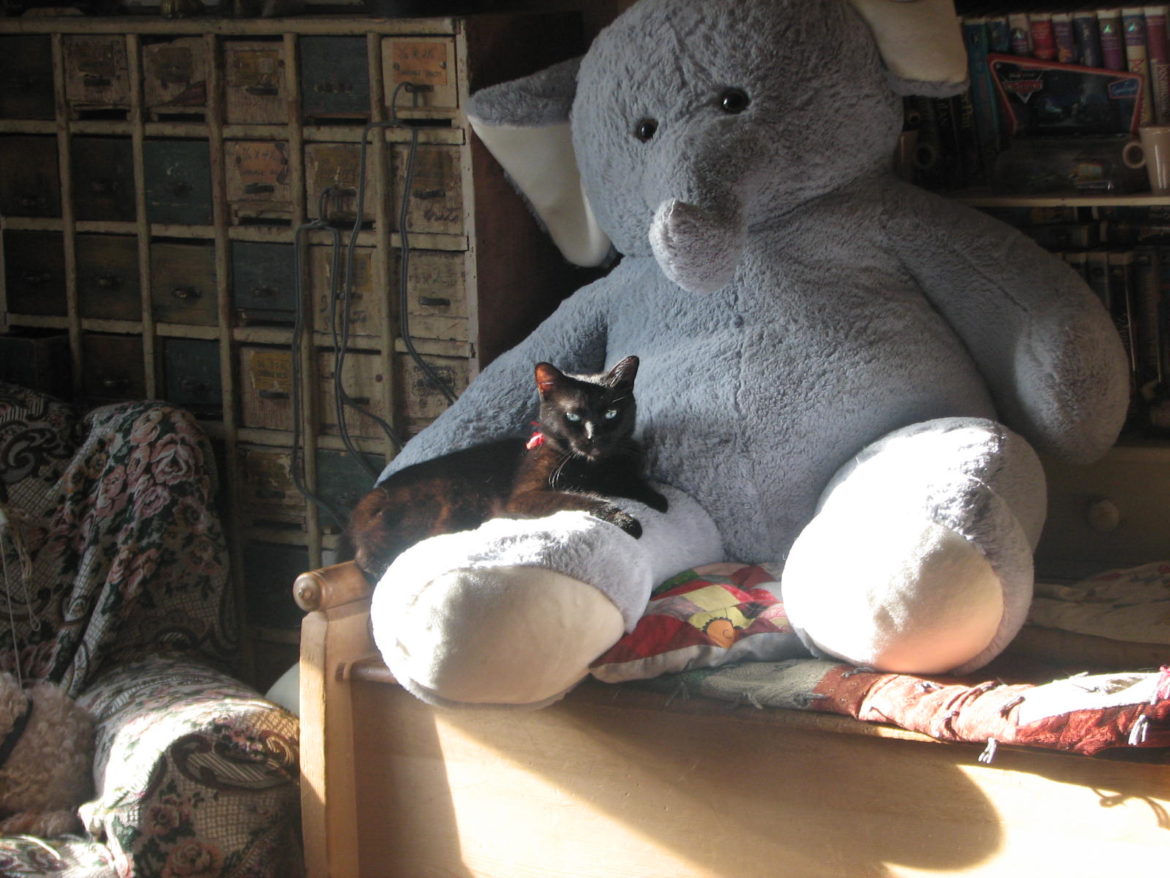 The cat too, has taken my tone seriously and after kneading a fluffy tummy for comfort, is cozily curled up with his elephant. (A story for another day… it may sound implausible, but this is who he loves)